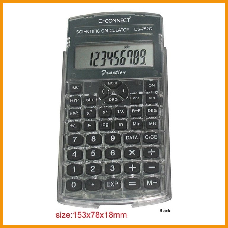 Q-Connect DS-752C -funktiolaskimessa on monipuoliset toiminnot kovaankin käyttöön. Laskimessa on 10 numeron 1-rivinen näyttö ja 145 toimintoa. Laitteen avulla sujuvat mm. yhden muuttujan tilastotoiminnot, trigonometriset funktiot (RAD/GRAD), käänteisfunktiot, murtoluvut, hyberboliset- ja käänteishyberboliset funktiot, seksagesimaali- ja desimaalimuunnokset, kombinaatiot ja permutaatiot, logaritmit ja eksponenttifunktiot, juuret ja potenssit, koordinaattien väliset muunnokset, toisen asteen yhtälöt ja tilastotominnot (keskiarvo/keskihajonta). Insinöörimuoto ENG/ENG.Mitat: 15,3 x 7,8 x 1,8 cm, paino 112 g
