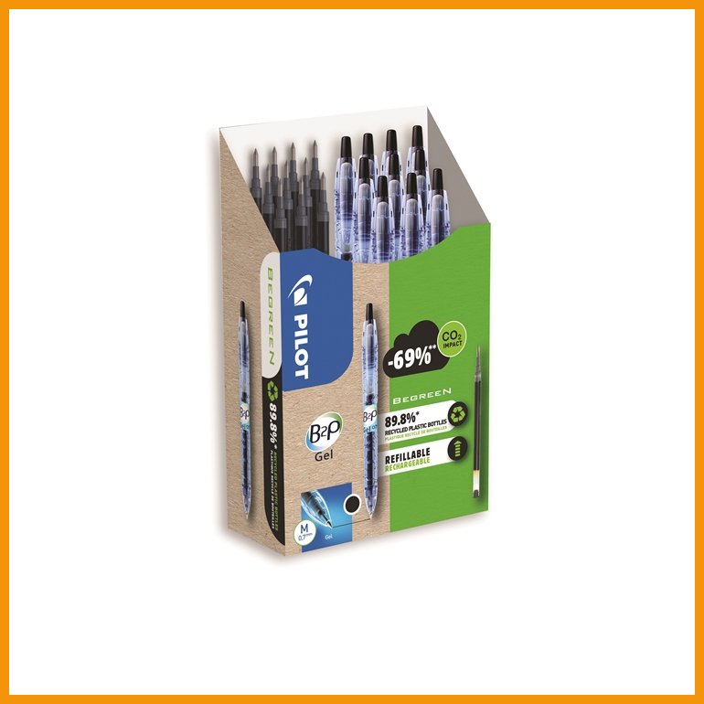 Pilot BeGreen B2P mustan geelikynän runko on valmistettu 89-prosenttisesti kierrätetyistä PET-muovisista palautuspulloista. Painomekanismilla varustetussa kynässä on muovinen klipsi ja sujuvasti juokseva arkistokelpoinen geelimuste.Pakkauksessa on 10 kynää ja jokaiseen vaihtosäiliö. Vaihtamalla koko kynän sijaan pelkän mustesäiliön tuotat vähemmän roskaa.