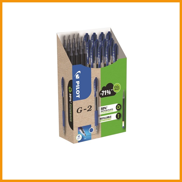 Pilot G-2 on klassinen ja toimintavarma geelikynä painomekanismilla, kumisella otepinnalla, läpinäkyvällä rungolla ja taskuklipsillä. Geelipohjainen muste juoksee liukkaasti paperilla, kuivuu nopeasti ja jättää jälkeensä eläväiset värit tahraamatta ja sottaamatta.Kynä on valmistettu 70-prosenttisesti kierrätysmateriaaleista. Tässä pakkauksessa on 12 Pilotin bestseller-kynää ja jokaiseen vaihtosäiliö. Vaihtamalla koko kynän sijaan pelkän mustesäiliön vähennät ympäristön kuormitusta selvästi - kolmen uudelleentäytön jälkeen hiilijalanjälkesi pienenee jopa 71 %.