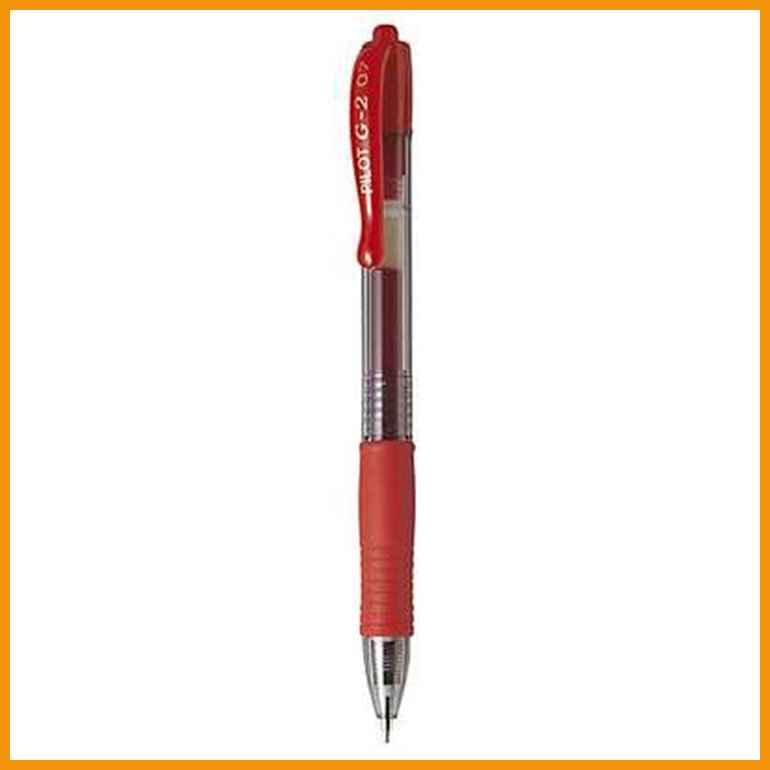 Pilot G-2 on klassinen ja toimintavarma punainen geelikynä painomekanismilla, kumisella otepinnalla, läpinäkyvällä rungolla ja taskuklipsillä. Geelipohjainen muste juoksee liukkaasti paperilla, kuivuu nopeasti ja jättää jälkeensä eläväiset värit tahraamatta ja sottaamatta.Tuote on valmistettu 70-prosenttisesti kierrätysmateriaaleista.