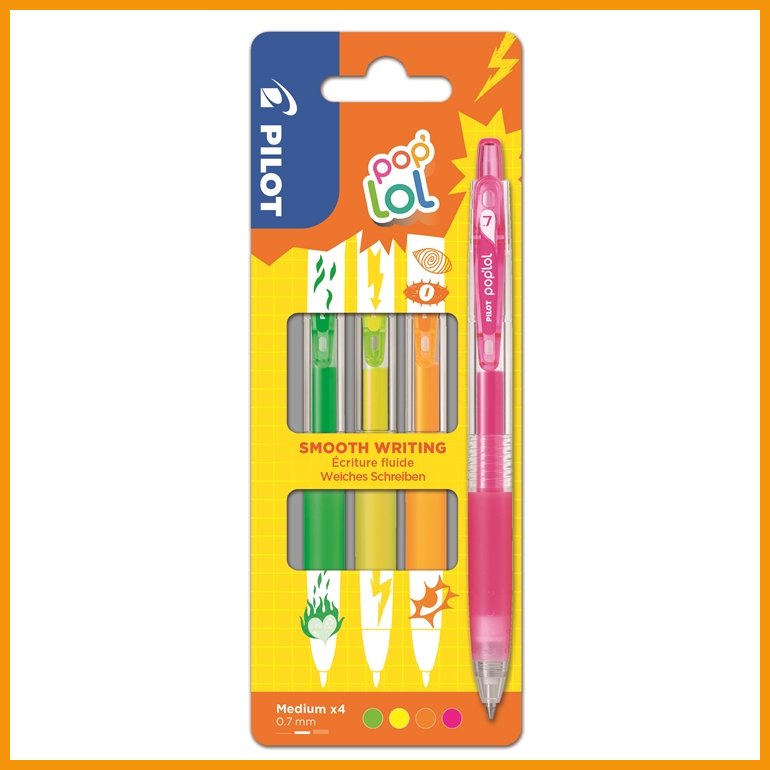 Pilot Pop'lol on medium-kärjellä varustettu japanilainen geelikynä, joka soveltuu niin kirjoittamiseen kuin piirtämiseenkin. Kynässä on paksu ja tasaisesti levittyvä muste, joka tuottaa peittävän ja siistin jäljen. Kynä jättää kirkkaat ja elävät värit myös tummalle paperille, ja kuivuu nopeasti ilman tahriintumista.Rungossa on kuminen otealue, painomekanismi sekä taskuklipsi.