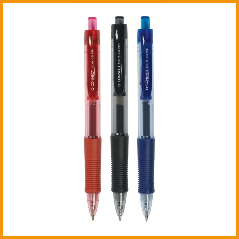 Q-connect geelikynä punainen Sigma on painomekanismilla varustettu kuulakärkikynä, jossa on läpinäkyvä runko ja musteen väriset kuminen otepinta ja muoviklipsi. Kynässä on salamannopeasti kuivuva ja jouhevasti kirjoittava geelimuste, joka ei jätä suttuja.Musteen väri: punainen