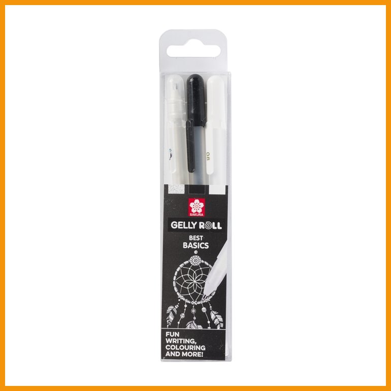 Sakura Gelly Roll Basic on erilainen setti muovirunkoisia ja klipsillä varustettuja geelikyniä: yhdessä on kirkkaan valkoinen, toisessa peittävä musta ja kolmannessa kimalteleva glittermuste. Vedenkestävä ja haalistumaton pigmenttimuste näkyy hyvin erilaisilta pinnoilta, valkoinen etenkin tummilta sellaisilta. Päästä mielikuvituksesi valloilleen!Musteen väri: valkoinen, musta ja glitter