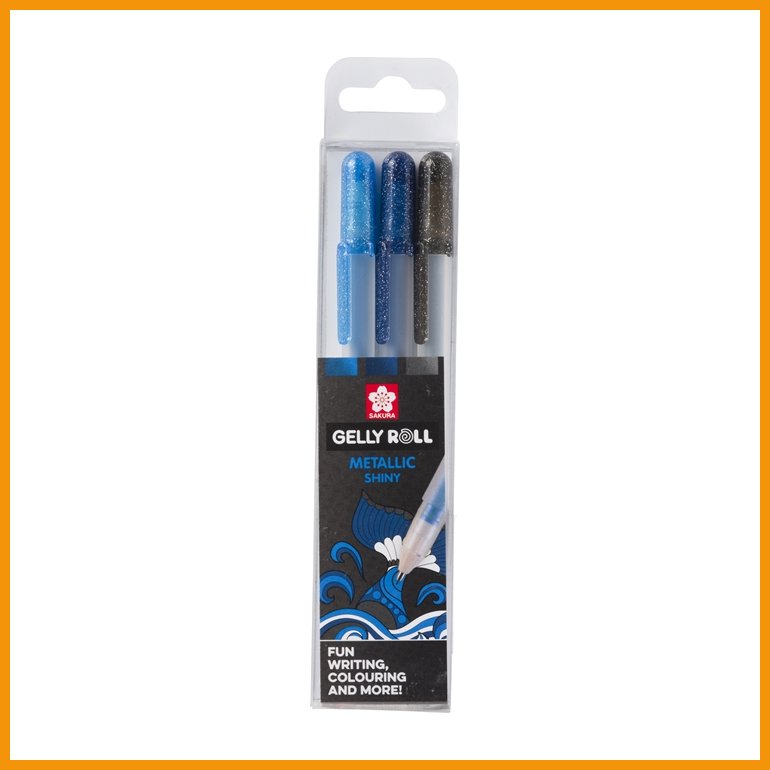 Sakura Gelly Roll Metallic Ocean on metallinhohtoinen setti muovirunkoisia ja klipsillä varustettuja geelikyniä. Vedenkestävä ja haalistumaton pigmenttimuste hohtaa niin valkoisella kuin etenkin tummilla pinnoilla. Päästä mielikuvituksesi valloilleen!Musteen väri: sininen, musta ja sinimusta