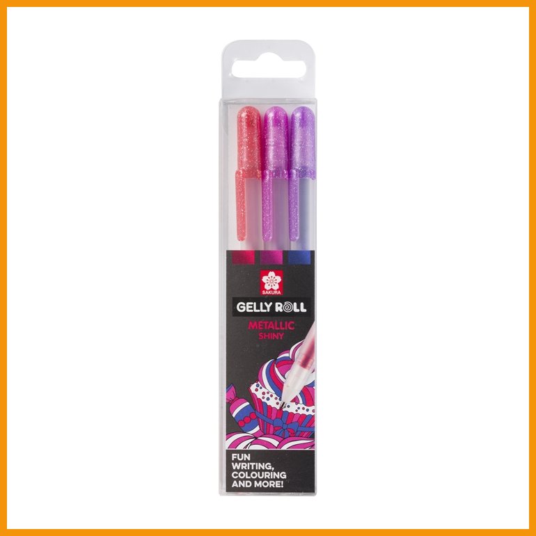 Sakura Gelly Roll Metallic Sweets on metallinhohtoinen setti muovirunkoisia ja klipsillä varustettuja geelikyniä. Vedenkestävä ja haalistumaton pigmenttimuste hohtaa niin valkoisella kuin etenkin tummilla pinnoilla. Päästä mielikuvituksesi valloilleen!Musteen väri: purppura, pinkki ja punainen