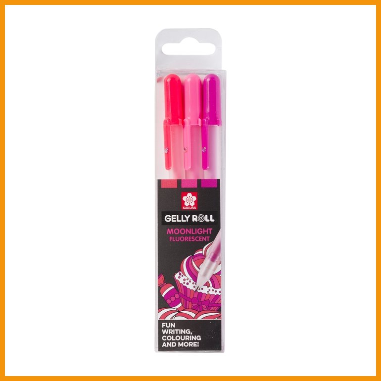 Sakura Gelly Roll Moonlight Sweets on setti muovirunkoisia ja klipsillä varustettuja fluoresoivia geelikyniä, jotka UV-valoa saatuaan hehkuvat pimeässä. Vedenkestävä ja haalistumaton pigmenttimuste säihkyy niin valkoisella kuin etenkin tummilla pinnoilla. Päästä mielikuvituksesi valloilleen!Musteen väri: punainen, pinkki ja vaaleanpunainen