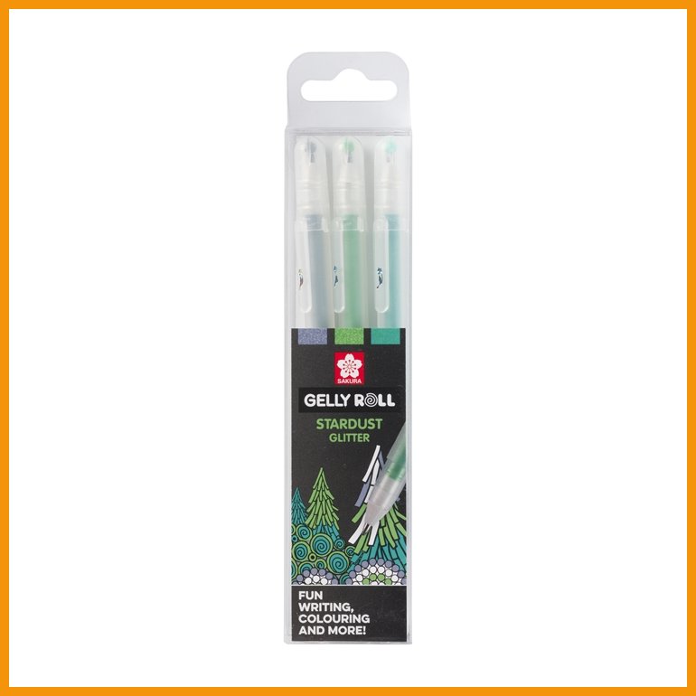 Sakura Gelly Roll Stardust Forest on glitterinhohtoinen setti muovirunkoisia ja klipsillä varustettuja geelikyniä. Vedenkestävä ja haalistumaton pigmenttimuste kimaltelee niin valkoisella kuin tummillakin pinnoilta. Päästä mielikuvituksesi valloilleen!Musteen väri: hopea, vihreä ja lime