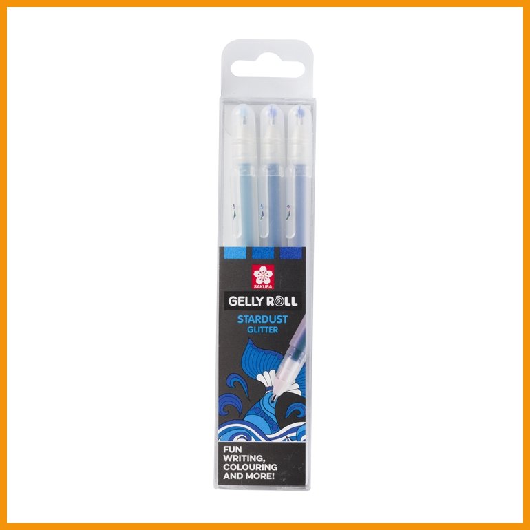 Sakura Gelly Roll Stardust Ocean on glitterinhohtoinen setti muovirunkoisia ja klipsillä varustettuja geelikyniä. Vedenkestävä ja haalistumaton pigmenttimuste kimaltelee niin valkoisella kuin tummillakin pinnoilta. Päästä mielikuvituksesi valloilleen!Musteen väri: kolme sininen sävyä