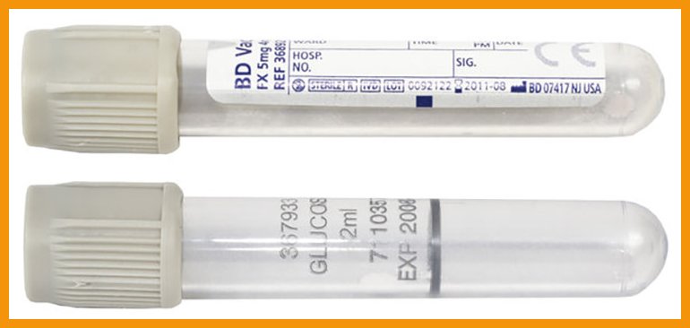 BD Vacutainer -glukoosiputki, lisäaineina Na-fluoridi ja K-oksalaatti.Koko: 5/4 ml