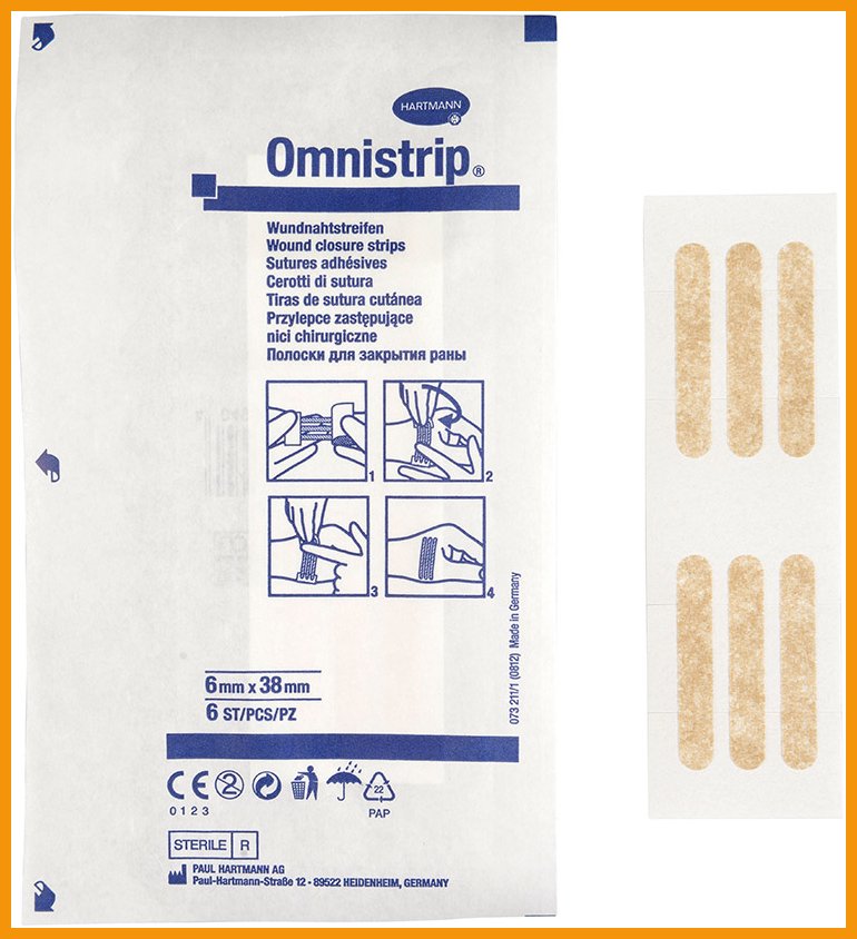 Hartmann Omnistrip on steriili ja hypoallerginen haavansulkuteippi pienten ja kirurgisten haavojen sulkemiseen, suljettujen haavanreunojen kiinnittämiseen ja tuoreiden arpien suojaamiseen. Teippi on valmistettu ihonvärisestä polyamidikuidusta ja polyakrylaattiliimasta.Mitat: 38 x 6 mm