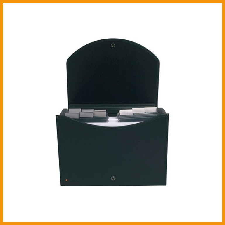 Exacompta Exacase -haitarisalkussa on 13 osastoa A4-kokoisille dokumenteille. Hakemistokielekkeet etiketeille helpottavat oikean dokumentin löytämistä. Salkussa on kantokahva ja napakka nepparisuljenta. Kannet ovat kierrätettyä PP-muovia (2 mm) ja taskut polypropeenia.Väri: musta.