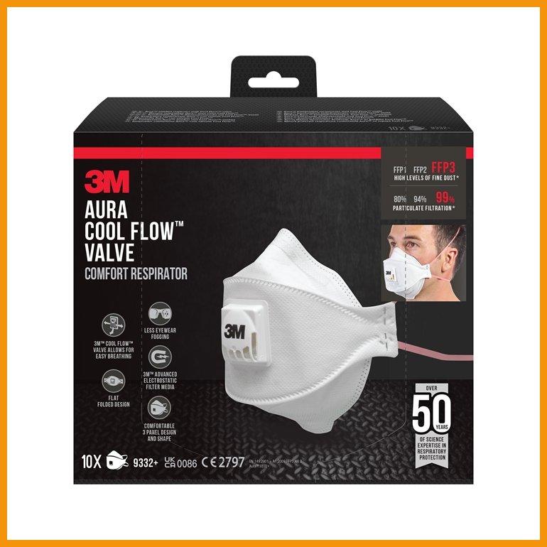 3M Aura Comfort Cool Flow 9332+ on FFP3-luokan kertakäyttöinen hiukkassuojain hengityksen suojaukseen hienojakoiselta pölyltä esimerkiksi seinien, sisä- ja ulkokattojen tai lattioiden korjaus- ja eristystöissä. Kolmipaneelinen rakenne, vaahtomuovinen nenäkappale ja muotoiltava nenäpuristin pitävät suojaimen tiiviisti ja mukavasti paikallaan. Uloshengitysventtiili auttaa poistamaan kuuman ja kostean hengitysilman kasvoilta.FFP3-luokan hengityssuojain suodattaa 99 % hiukkasista.