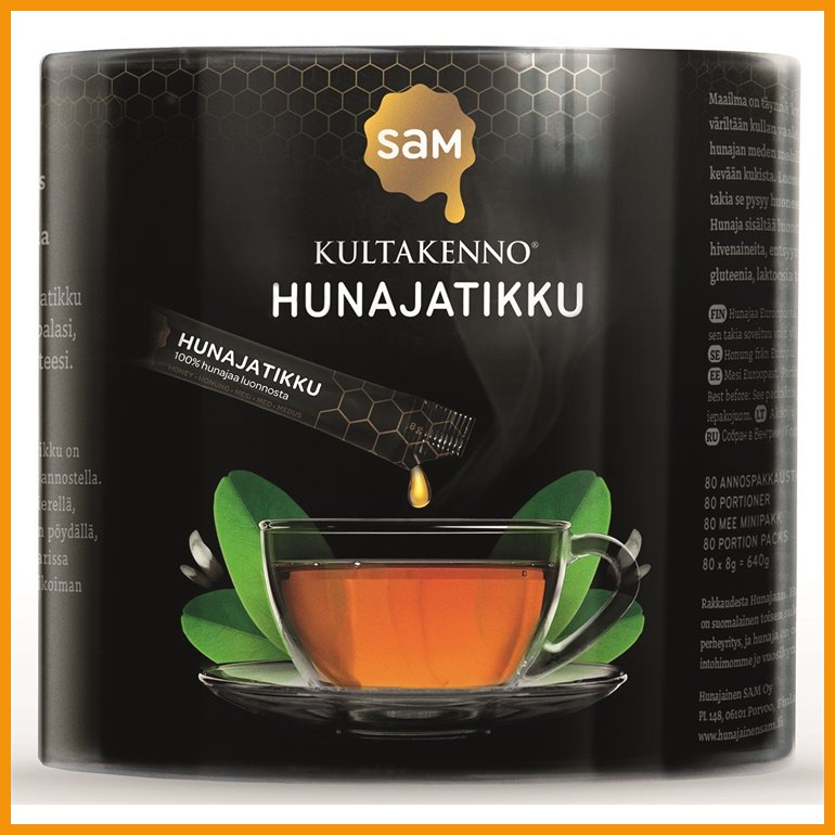 SAM Hunajatikku on väriltään vaaleaa ja maultaan mietoa hunajaa, jonka mesi on peräisin eurooppalaisista akaasioista ja muista kevään kukista. Hunajatikku on hygieeninen annostella ja elegantti tarjota niin espressokupin vierellä, aamupalabuffetissa, hotellihuoneen minibaarissa kuin kokouspalvelun teevalikoiman piristeenäkin.Sisältö: 8 g