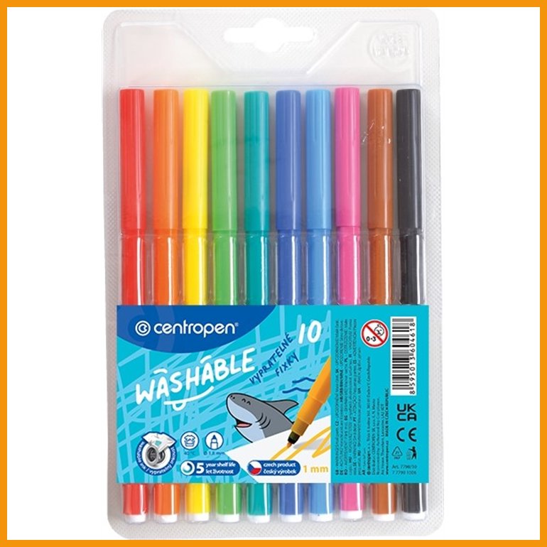 Centropen 7790 -huopakynän vesiliukoinen ja myrkytön muste peseytyy vaatteista 40 °C konepesussa. Vahvalla kärjellä varustettu kynä pysyy käyttökelpoisena vuosia. Korkki on ventiloitu.Kärki: pyöreäViivan leveys: 1,0 mm