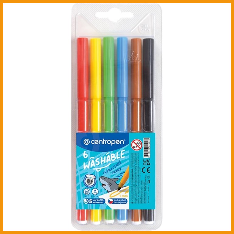 Centropen 7790 -huopakynän vesiliukoinen ja myrkytön muste peseytyy vaatteista 40 °C konepesussa. Vahvalla kärjellä varustettu kynä pysyy käyttökelpoisena vuosia. Korkki on ventiloitu.Kärki: pyöreäViivan leveys: 1,0 mm