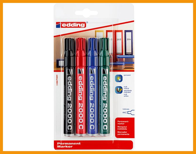 Edding 2000C on vankka huopakynä monipuoliseen ja vaativaan käyttöön. Kynässä on kestävä, 100-prosenttisesti kierrätysalumiinista valmistettu runko ja suojakorkki. Mustesäiliö voidaan täyttää uudelleen, ja kynään on saatavana myös vaihtokärkiä.Pysyvä ja hajuton muste on sekä veden-, valon- että kuumuutta (jopa yli 200 astetta) kestävää eikä sisällä tolueenia tai xyleeniä. Muste tarttuu siististi kaikenlaisille pinnoille, kuten paperille, kartongille, muoville, metallille, puulle, nahalle ja lasille.