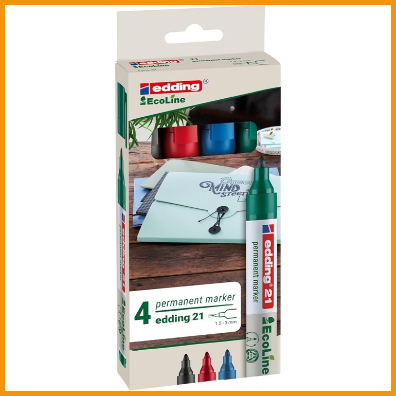 Edding 21 Ecoline -huopakynän runko ja muut muoviosat on valmistettu vähintään 90-prosenttisesti kierrätetyistä materiaaleista, mustesäiliön voi täyttää uudelleen ja saatavilla on jopa vaihtokärkiä. Suojakorkissa on taskuklipsi.Pysyvä muste on lähes hajutonta, kestää vettä ja valoa eikä sisällä xyleeniä tai tolueenia. Se myös kuivuu nopeasti ja tarttuu lähes kaikenlaisille pinnoille, kuten paperille, kartongille, lasille, puulle, muoville ja metallille.