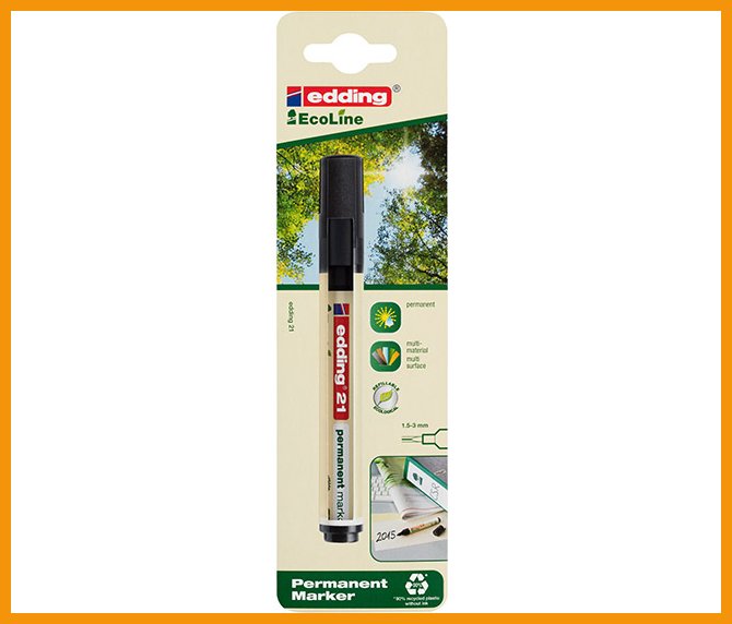 Edding 21 Ecoline mustan huopakynän runko ja muut muoviosat on valmistettu vähintään 90-prosenttisesti kierrätetyistä materiaaleista, mustesäiliön voi täyttää uudelleen ja saatavilla on jopa vaihtokärkiä. Suojakorkissa on taskuklipsi.Pysyvä muste on lähes hajutonta, kestää vettä ja valoa eikä sisällä xyleeniä tai tolueenia. Se myös kuivuu nopeasti ja tarttuu lähes kaikenlaisille pinnoille, kuten paperille, kartongille, lasille, puulle, muoville ja metallille.