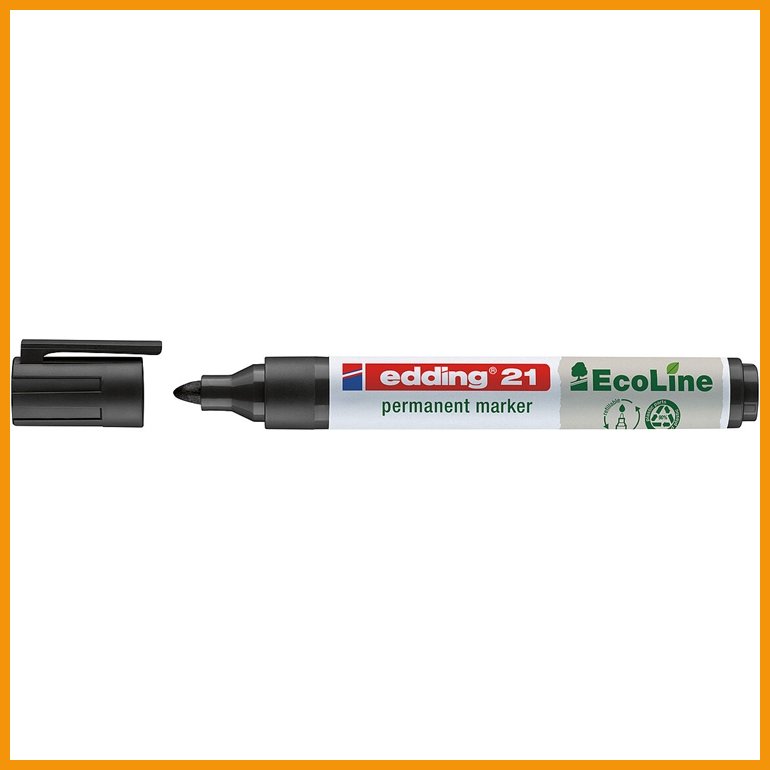Edding 21 Ecoline mustan huopakynän runko ja muut muoviosat on valmistettu vähintään 90-prosenttisesti kierrätetyistä materiaaleista, mustesäiliön voi täyttää uudelleen ja saatavilla on jopa vaihtokärkiä. Suojakorkissa on taskuklipsi.Pysyvä muste on lähes hajutonta, kestää vettä ja valoa eikä sisällä xyleeniä tai tolueenia. Se myös kuivuu nopeasti ja tarttuu lähes kaikenlaisille pinnoille, kuten paperille, kartongille, lasille, puulle, muoville ja metallille.