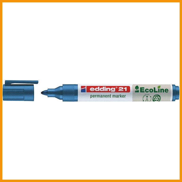 Edding 21 Ecoline sinisen huopakynän runko ja muut muoviosat on valmistettu vähintään 90-prosenttisesti kierrätetyistä materiaaleista, mustesäiliön voi täyttää uudelleen ja saatavilla on jopa vaihtokärkiä. Suojakorkissa on taskuklipsi.Pysyvä muste on lähes hajutonta, kestää vettä ja valoa eikä sisällä xyleeniä tai tolueenia. Se myös kuivuu nopeasti ja tarttuu lähes kaikenlaisille pinnoille, kuten paperille, kartongille, lasille, puulle, muoville ja metallille.