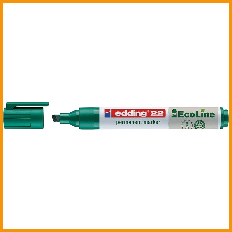 Edding 22 Ecoline vihreän huopakynän runko ja muut muoviosat on valmistettu vähintään 90-prosenttisesti kierrätetyistä materiaaleista, mustesäiliön voi täyttää uudelleen ja saatavilla on jopa vaihtokärkiä. Suojakorkissa on taskuklipsi.Pysyvä muste on lähes hajutonta, kestää vettä ja valoa eikä sisällä xyleeniä tai tolueenia. Se myös kuivuu nopeasti ja tarttuu lähes kaikenlaisille pinnoille, kuten paperille, kartongille, lasille, puulle, muoville ja metallille.