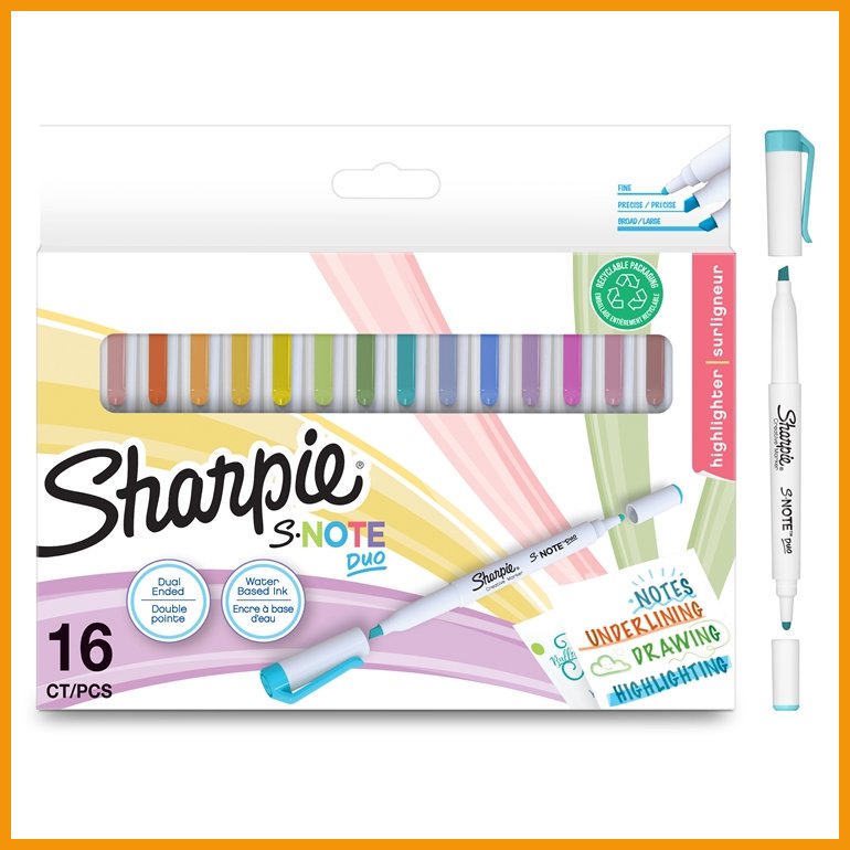 Sharpie S-Note Duo on kaksipäinen huopakynä, jolla voit helposti vaihdella ohuempien viivojen ja leveiden vetojen välillä. Yksi kärjistä on kapea ja pyöreä ja toinen viisto. Viiston kärjen reunalla voi tehdä erityisen tarkkaa jälkeä. Vesipohjainen ja vuotamaton muste soveltuu sekä korostamiseen, alleviivaamiseen että piirtämiseen. Tee muistiinpanoistasi värikäs elämys!Kärjet: fine ja viisto
