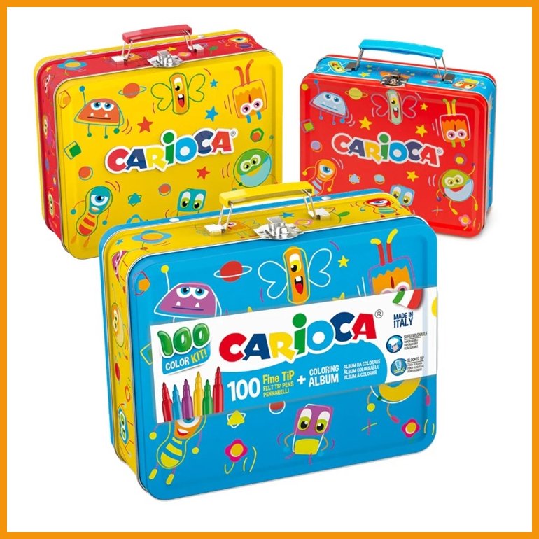 CARIOCA 100 Color Kit -huopakynälajitelmassa on 100 fine-kärkistä huopakynää ja värityskirja. Lajitelma on pakattu kahvalliseen metallilaatikkoon, joka kulkee näppärästi pienen taiteilijan mukana.Värilajitelma