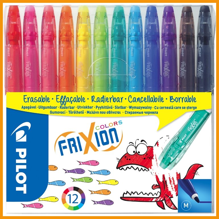 Pilot Frixion Colors -huopakynän innovatiivisen ja paperille vaivattomasti liukuvan FriXion-musteen voi pyyhkiä pois kitkan aiheuttaman lämmön avulla, esimerkiksi kynän päässä olevalla pyyhekumilla hankaamalla. Poispyyhkiminen onnistuu jopa vuosien kuluttua kirjoitushetkestä, joten ethän käytä kynää allekirjoituksiin!Kärki: medium