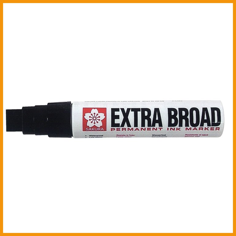 Sakura Extra Broad mustan huopakynän yksi markkinoiden leveimmistä viistokärjistä kestää kovaakin käyttöä. Miedosti tuoksuva ja xyleenitön muste on vedenkestävää ja tarttuu pysyvästi useimmille pinnoille, kuten muoville, metallille, puulle, betonille, lasille ja kartongille.Musteen väri: musta