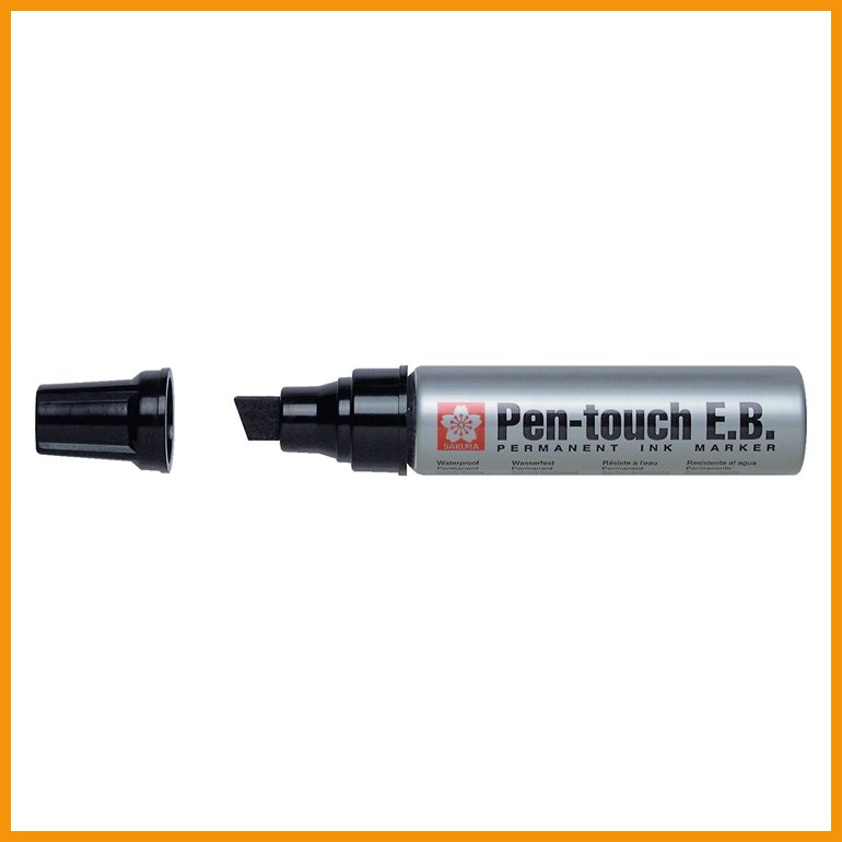 Sakura Pen-Touch E.B. Mustan huopakynän pysyvä ja taatusti näkyvä väriaine sisältää xyleeniä, joka tekee siitä erittäin voimakkaasti kiinnittyvän. Kynä tarttuu niin kumi-, metalli-, lasi-, kivi-, puu-, sementti-, posliini- kuin muovipintoihinkin (ei kuitenkaan styroxiin) ja erittäin leveä viistokärki kestää kovaakin käyttöä. Spriiliukoinen muste kestää vettä ja haalistumista. Huom! Muste ei ole pysyvää lasi- tai keramiikkapinnoilla.Musteen väri: musta