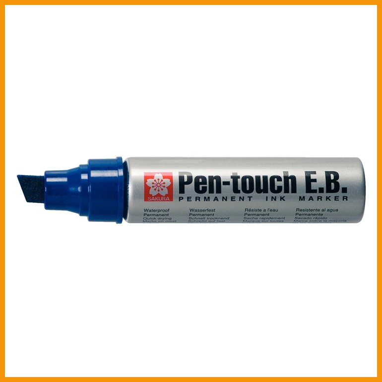 Sakura Pen-Touch E.B. Sinisen huopakynän pysyvä ja taatusti näkyvä väriaine sisältää xyleeniä, joka tekee siitä erittäin voimakkaasti kiinnittyvän. Kynä tarttuu niin kumi-, metalli-, lasi-, kivi-, puu-, sementti-, posliini- kuin muovipintoihinkin (ei kuitenkaan styroxiin) ja erittäin leveä viistokärki kestää kovaakin käyttöä. Spriiliukoinen muste kestää vettä ja haalistumista. Huom! Muste ei ole pysyvää lasi- tai keramiikkapinnoilla.Musteen väri: sininen