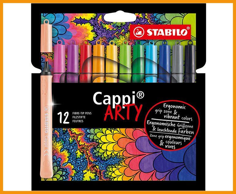 STABILO Cappi -huopakynässä on kolmikulmainen runko ja korkin läpi kulkeva reikä, josta korkin voi kiinnittää mukana tulevalla muovinauhalla. Näin korkki ei pääse katoamaan. Kirkasvärinen ja konepesussa useimmista vaatteista irtoava muste ei kuivu, vaikka korkki jäisi auki 24 tunniksi.Viivan leveys: 1,0 mm