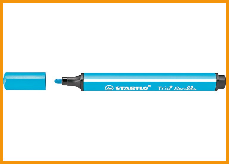 STABILO Trio Scribbi on erittäin kestävällä joustokärjellä ja kolmikulmaisella rungolla varustettu huopakynä erityisesti pienten lasten käyttöön. Sisään painuva ja sieltä paineen hellittäessä esiin hyppäävä joustokärki pysyy hyväkuntoisena, vaikka pieni taiteilija ei vielä aivan hallitsisi voimiaan. Helposti pesussa käsistä ja vaatteista irtoava vesiliukoinen muste saa aikaan kirkkaat värit. Korkki on ventiloitu.Viivan leveys: 1,5 - 2 mm