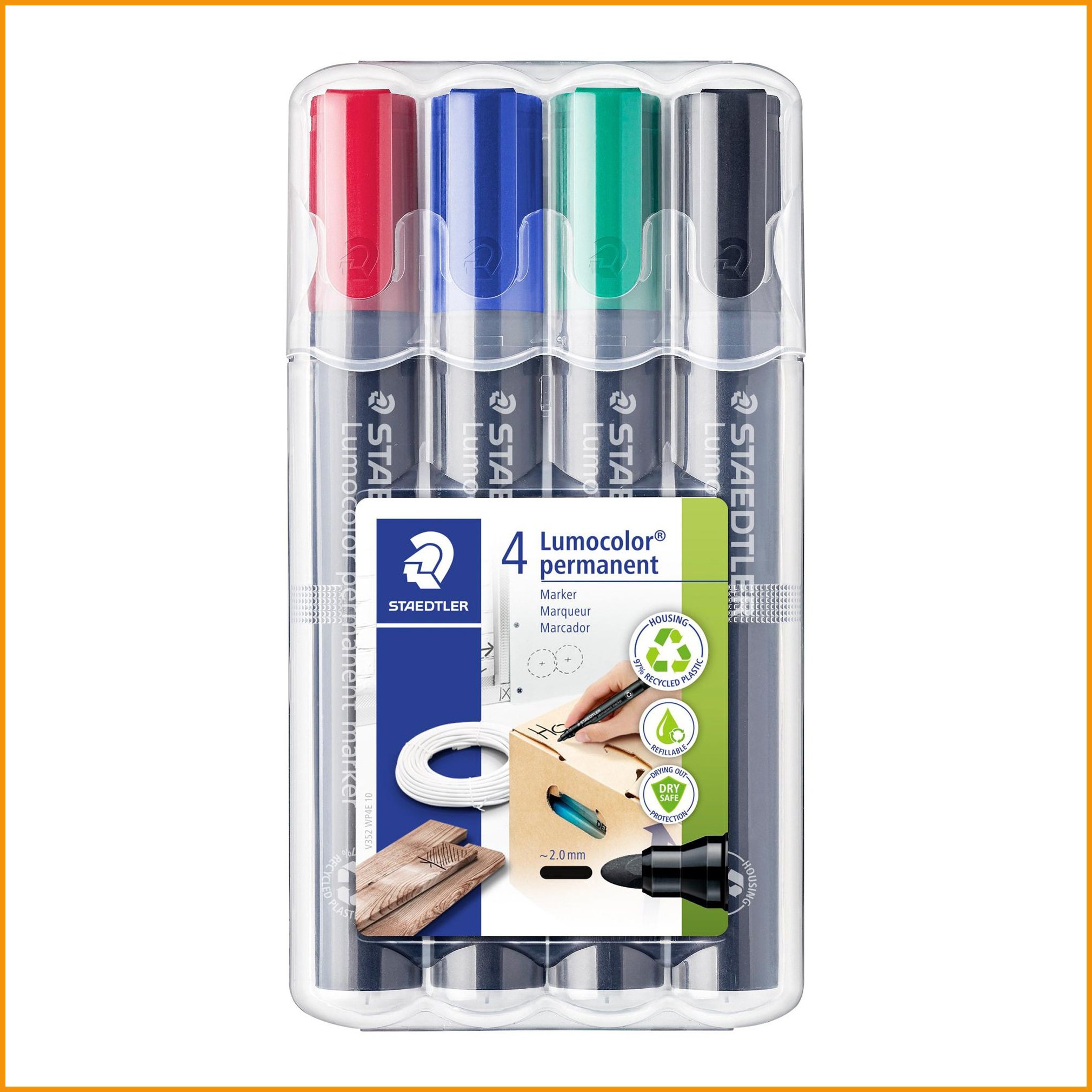 Akryylikärkisen staedtler 352 -huopakynän pysyvä muste tarttuu lähes kaikille pinnoille, kuten paperi, kartonki, muovi, kumi, metalli, cd, puu, lasi, posliini ja nahka. spriiliukoinen, miedon tuoksuinen ja valonkestävä muste kuivuu nopeasti paperilla ja sopii siksi hyvin myös vasenkätisille. korkki voi olla auki useita päiviä musteen kuivumatta. ei sisällä xyleeniä eikä tolueenia. kätevässä pakkauksessa on neljä eri väristä tussia: musta, sininen, punainen ja vihreä. vihreä ja musta väri ovat säänkestäviä. pyöreä kärki, viivan leveys 1-2 mm. myyntierä: 1 pkt / 5 pkt / 120 pkt.Huopakynät toimitetaan 4 kappaleen erissä.