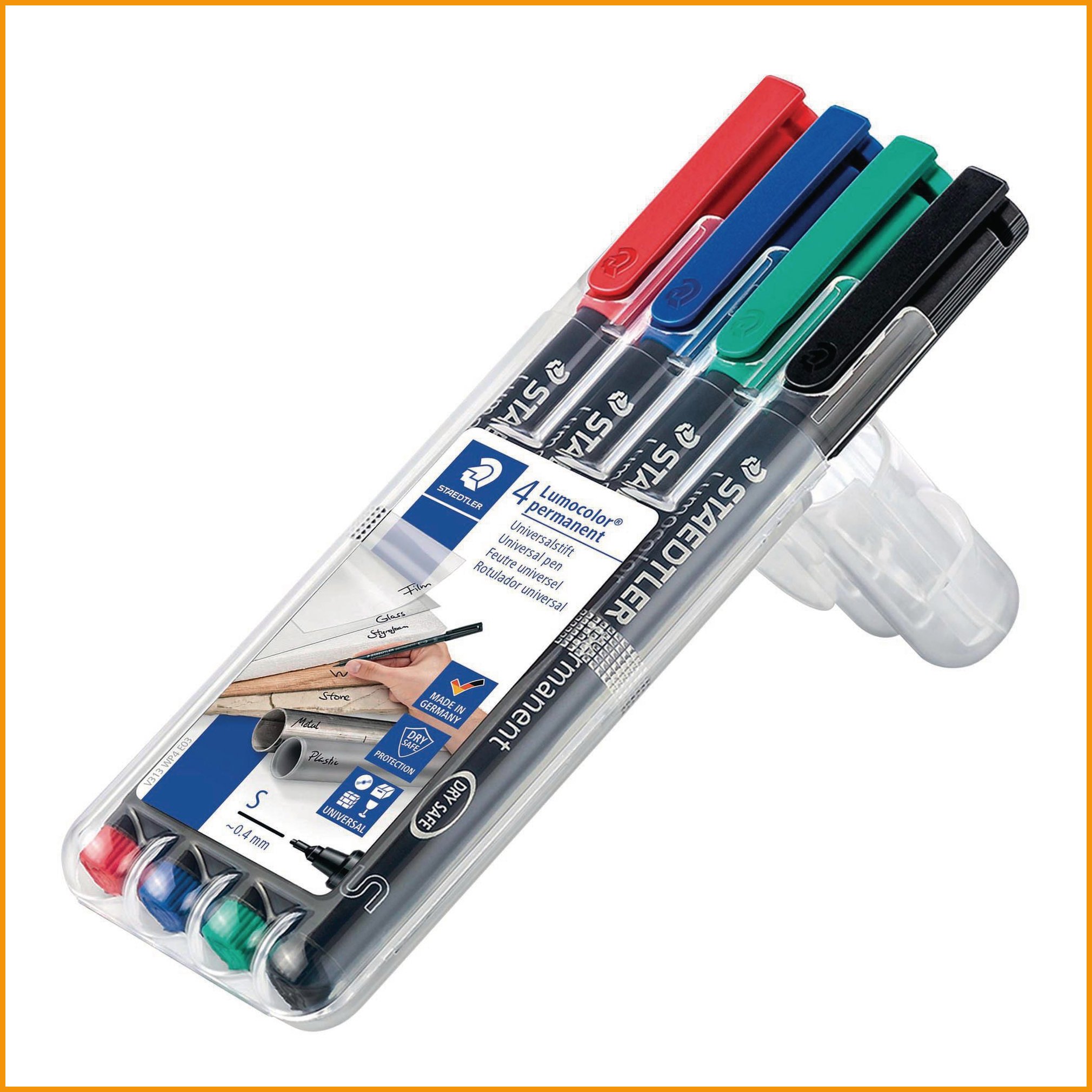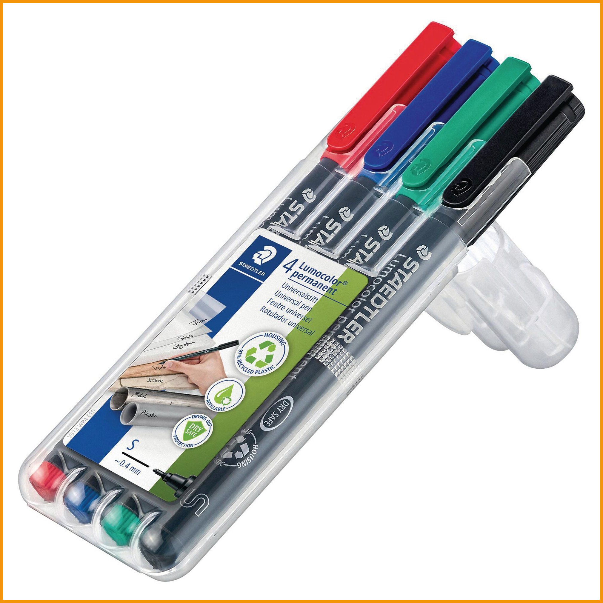 Staedtler lumocolor 313 -huopakynä tarttuu lähes kaikille pinnoille, kuten paperi, kartonki, muovikalvo, lasi, muovi, metalli, nahka, kivi, posliini ja puu. spriiliukoinen pysyvä muste kuivuu erittäin nopeasti, joten kynä soveltuu hyvin vasenkätisille. kynän mustesäiliö kestää lentokoneen paineen vuotamatta, ja korkki voi olla auki useita päiviä musteen kuivumatta. huopakynän muste on mietotuoksuinen. kynän runko on valmistettu 97 % kierrätetystä muovista. pakkauksessa on neljä väriä: musta, vihreä, sininen ja punainen. super fine -kärki, viivan leveys 0,4 mm. myyntierä: 1 pktHuopakynät toimitetaan 4 kappaleen erissä.