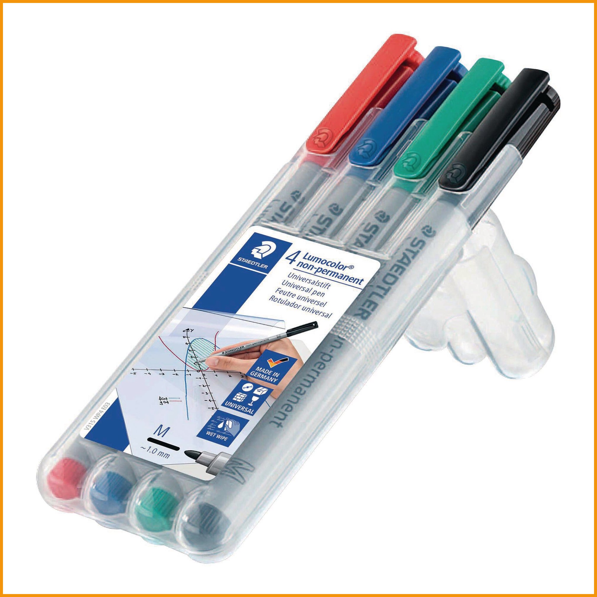 Staedtler lumocolor 315 -huopakynä tarttuu lähes kaikille pinnoille, kuten paperi, kartonki, muovikalvo, lasi, muovi, metalli, nahka, kivi, posliini ja puu. vesiliukoinen muste kuivuu erittäin nopeasti, joten kynä soveltuu hyvin vasenkätisille. kynän mustesäiliö kestää lentokoneen paineen vuotamatta, ja korkki voi olla auki useita päiviä musteen kuivumatta. huopakynän muste on mietotuoksuinen. kynän runko on valmistettu 97 % kierrätetystä muovista. medium-kärki, viivan leveys 1 mm. pakkauksessa on neljä väriä: musta, vihreä, punainen ja sininen. myyntierä: 1 ptk.Huopakynät toimitetaan 4 kappaleen erissä.
