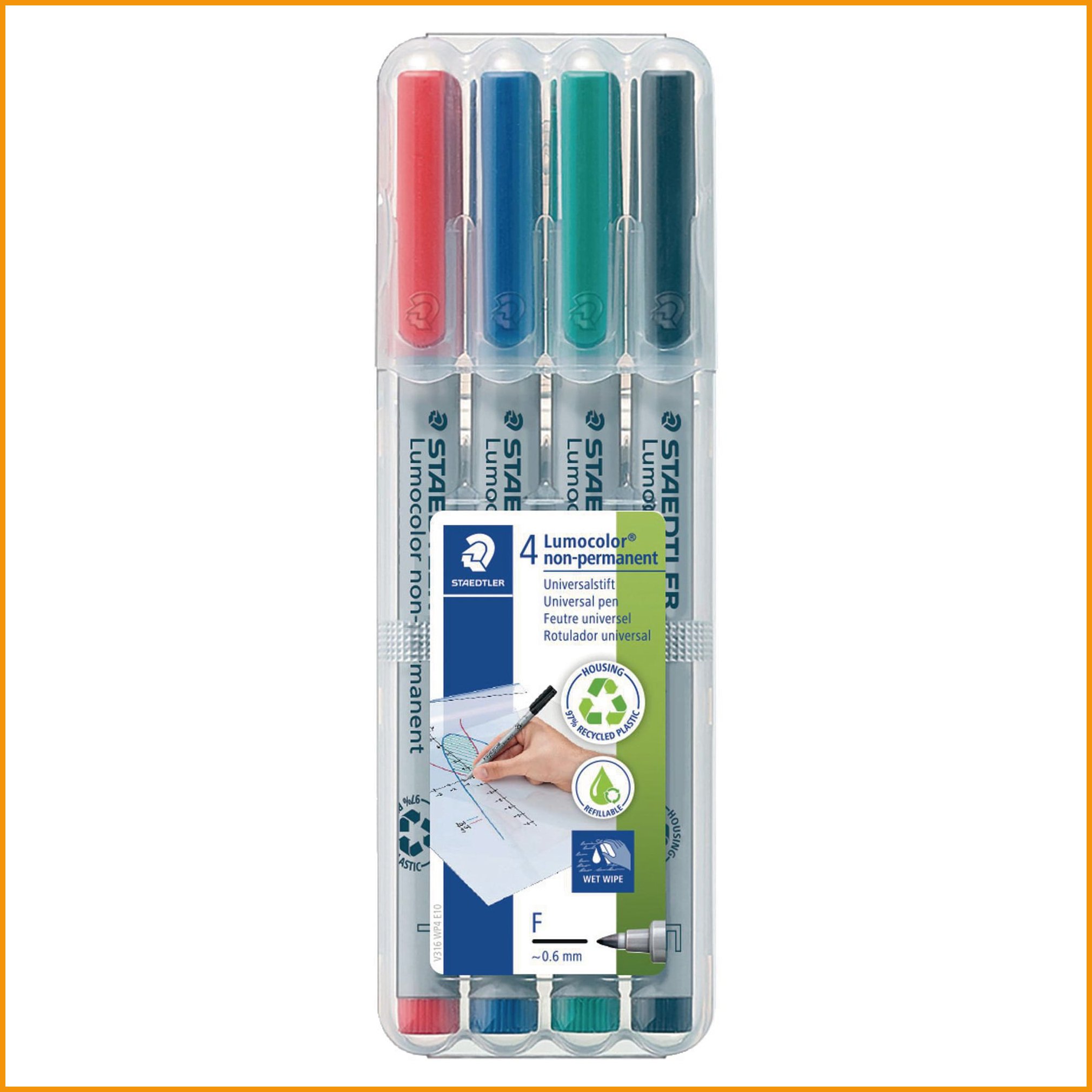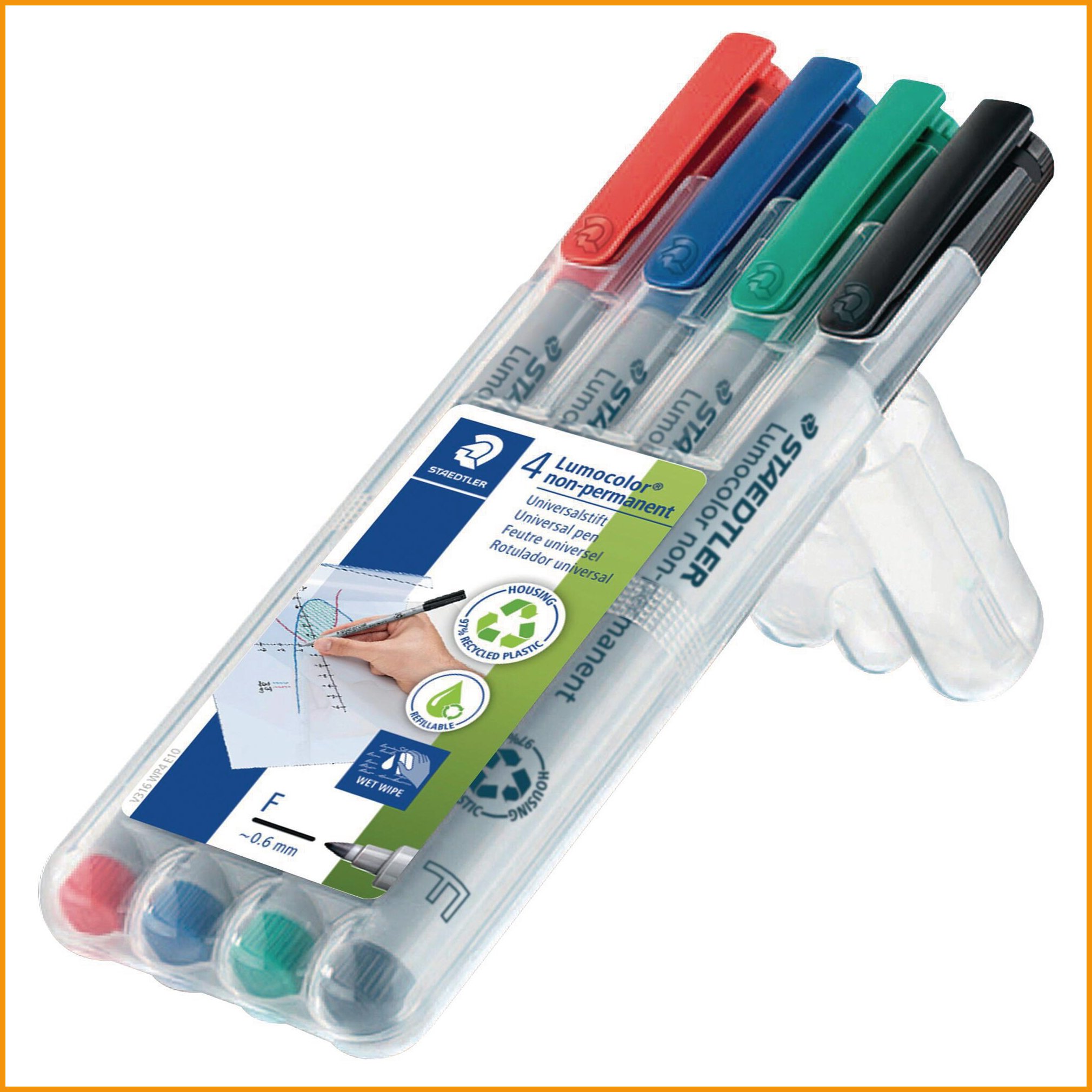 Staedtler lumocolor 316 -huopakynä tarttuu lähes kaikille pinnoille, kuten paperi, kartonki, muovikalvo, lasi, muovi, metalli, nahka, kivi, posliini ja puu. vesiliukoinen muste kuivuu erittäin nopeasti, joten kynä soveltuu hyvin vasenkätisille. kynän mustesäiliö kestää lentokoneen paineen vuotamatta, ja korkki voi olla auki useita päiviä musteen kuivumatta. huopakynän muste on mietotuoksuinen. kynän runko on valmistettu 97 % kierrätetystä muovista. fine -kärki, viivan leveys 0,6 mm. pakkauksessa on neljä väriä: musta, vihreä, sininen ja punainen. myyntierä: 1 pkt ( 10 kpl) / 100 pkt.Huopakynät toimitetaan 4 kappaleen erissä.