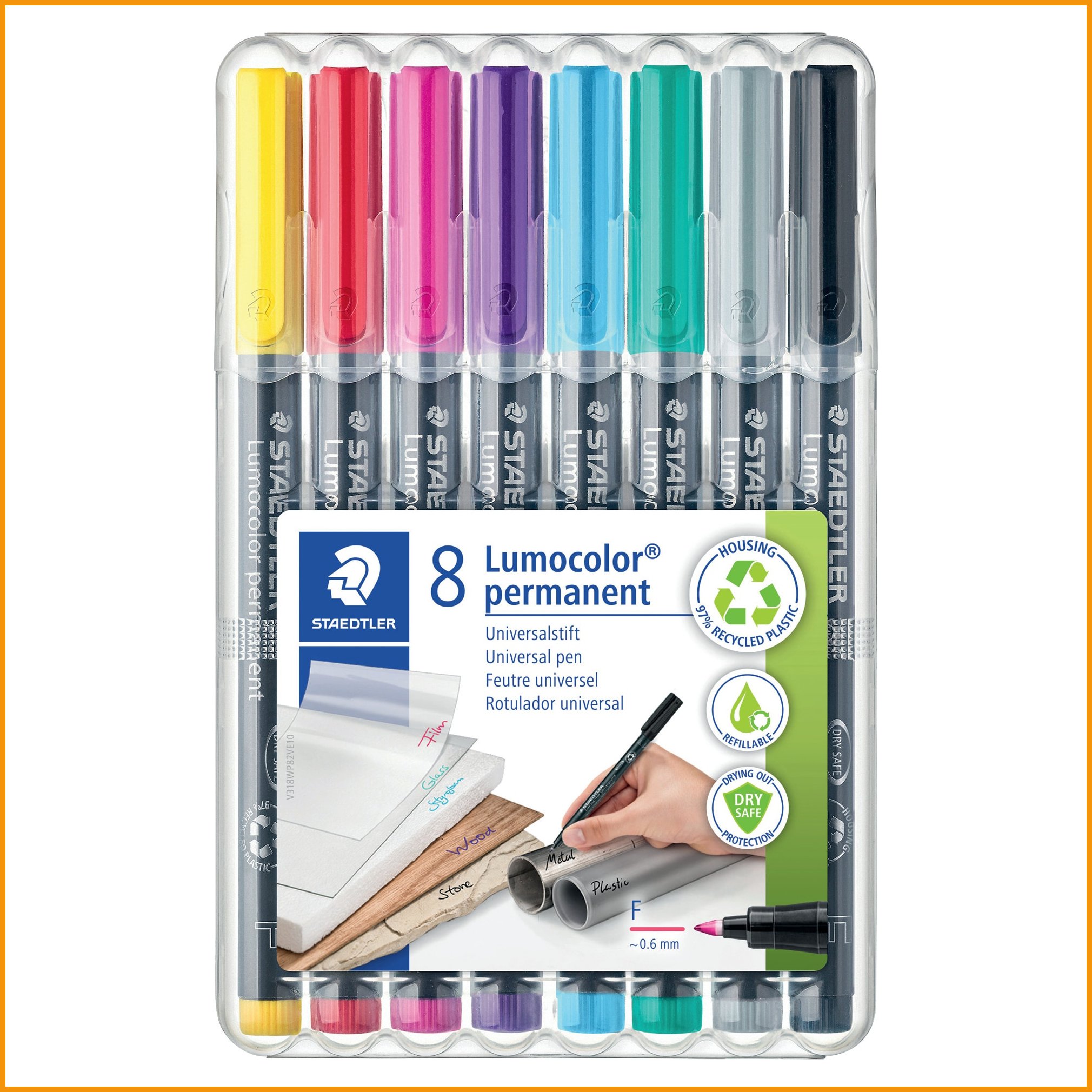 Hinta 7,66€ / 4 kplStaedtler lumocolor 318 -huopakynä tarttuu lähes kaikille pinnoille, kuten paperi, kartonki, muovikalvo, lasi, muovi, metalli, nahka, kivi, posliini ja puu. spriiliukoinen pysyvä muste kuivuu erittäin nopeasti, joten kynä soveltuu hyvin vasenkätisille. kynän mustesäiliö kestää lentokoneen ...