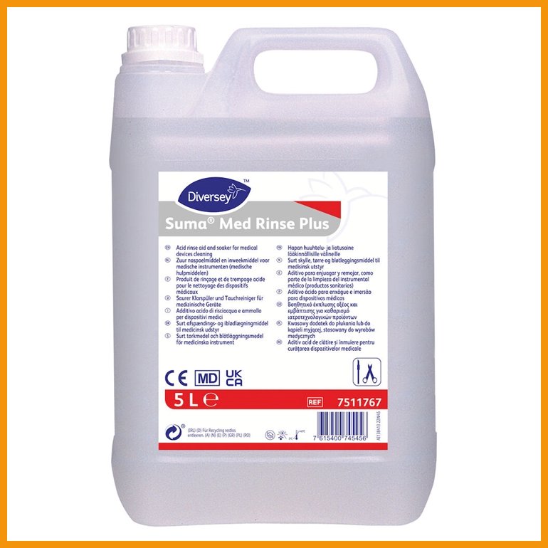 Diverseyn Suma Med Rinse Plus on hapan huuhtelu- ja liuotusaine lääketieteellisille instrumenteille. Myös saostumien poistamiseen soveltuva aine liuottaa tehokkaasti veren, ruosteen ja muun vaikean lian. Tuotteen koostumus takaa nopean kuivumisen ja estää pisarajälkien muodostumisen.