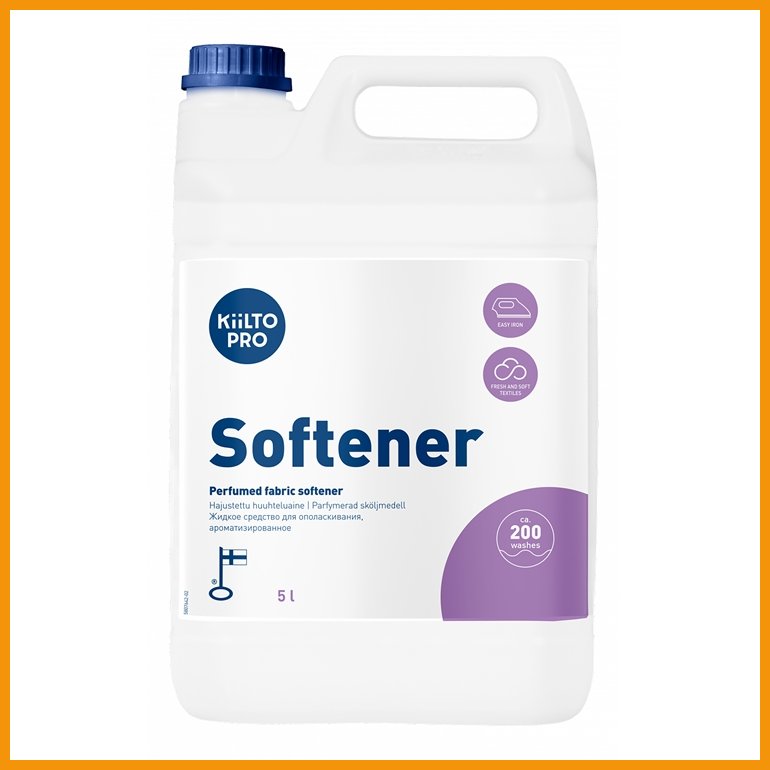 Kiilto Pro Softener on kasvipohjaisista raaka-aineista valmistettu vegaaninen huuhteluaine. Miedosti hajustettu huuhteluaine lyhentää kuivumisaikaa, tekee tekstiileistä pehmeitä, parantaa kankaiden siliävyyttä ja poistaa sähköisyyden synteettisistä kuiduista.Kotimaisella tuotteella on Avainlippu-tunnus.