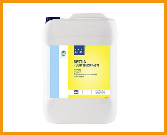 Kiilto Pro Restia Rinse-Aid on pesutuloksen viimeistelevä ja astioiden kuivumista nopeuttava huuhtelukirkaste. Ei pisarajälkiä. Koneelliseen astianpesuun tarkoitettu aine toimii pehmeissä ja keskikovissa vesissä.Tuotteella on pohjoismainen Joutsenmerkki.