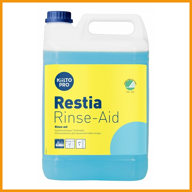 Kiilto Pro Restia Rinse-Aid on pesutuloksen viimeistelevä ja astioiden kuivumista nopeuttava huuhtelukirkaste. Ei pisarajälkiä. Koneelliseen astianpesuun tarkoitettu aine toimii pehmeissä ja keskikovissa vesissä.Tuotteella on pohjoismainen Joutsenmerkki.