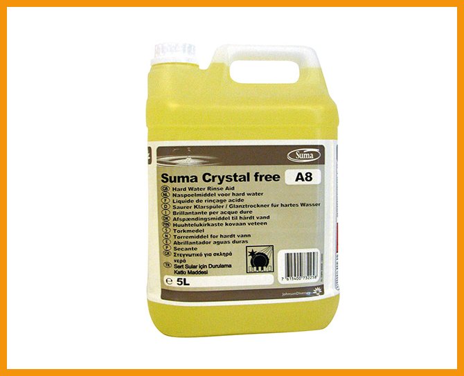 Suma Crystal Pur-Eco A8 on tiivistetty, nestemäinen, hapan ja matalavaahtoinen huuhtelukirkaste, joka estää kalkkisaostumien syntymisen. Kaikentyyppisiin astianpesukoneisiin ja koviinkin vesiin sopiva tuote sisältää pinta-aktiivisia aineita, jotka saavat astiat kuivumaan nopeasti kirkkaiksi ja ilman raitoja tai pisarajälkiä.Tuotteella on EU Ecolabel -ympäristösertifikaatti.