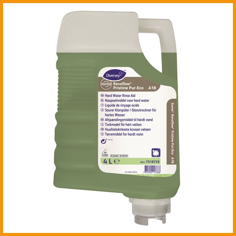 Huuhtelukirkaste Suma Revoflow Pristine A18 on tiivistetty matalavaahtoinen huuhteluainekirkaste, joka estää kalkkisaostumien syntymisen ja sopii Revoflow-annostelujärjestelmään. Suma Revoflow Pristine A18 on ympäristömerkitty (EU-kukka). Soveltuu käytettäväksi kaikentyyppisissä astianpesukoneissa. Tuote sisältää matalavaahtoisia pinta-aktiivisia aineita, jotka saavat aikaan nopean ja raidattoman kuivumisen sekä estävät vaahdon muodostumista. Lisäksi se sisältää kompleksinmuodostajia, jotka estävät saostumien syntymisen pesukoneeseen keskikovan ja kovan veden olosuhteissa. Tuotepakkausta on helppo käsitellä ja pakkausjätettä jää vähemmän. Innovatiivisen pakkausratkaisun ansiosta vältetään kosketus kemikaalien kanssa.Jos haluat tilata huuhtelukirkasteita täysin pakkauksin, niin LTK on 1 kappaletta.