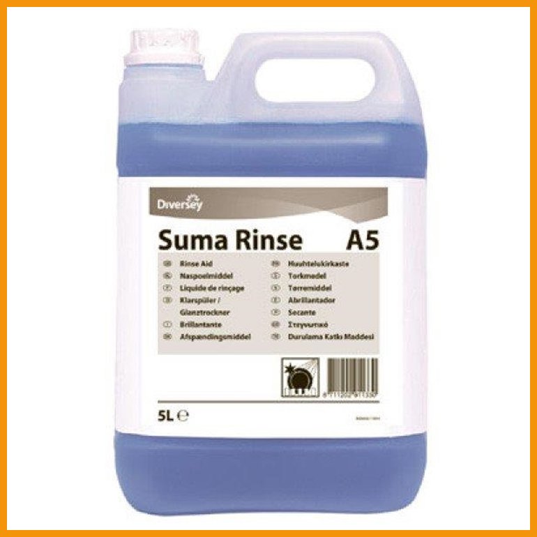 Diverseyn Suma Rinse A5 on nestemäinen ja matalavaahtoinen huuhtelukirkaste astioiden konepesuun. Neutraali aine sopii kaikentyyppisiin astianpesukoneisiin. Tuotteen ionittomat pinta-aktiiviset ainesosat nopeuttavat astioiden kuivumista ja estävät pisarajälkien muodostumisen.Pakkauskoko: 5 litraa