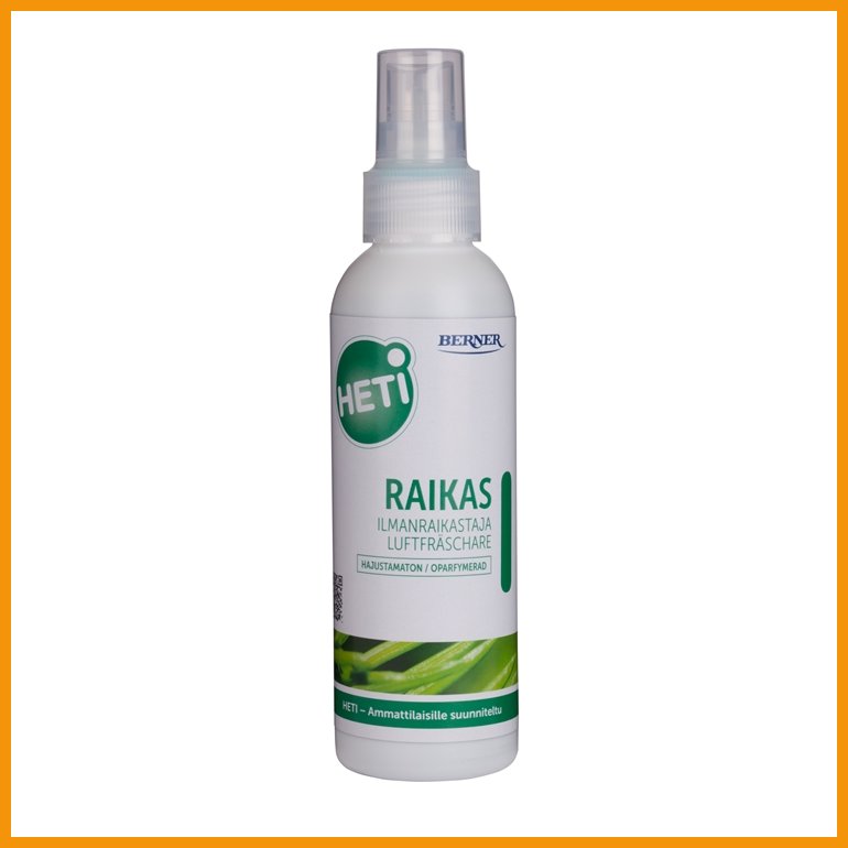 HETI Raikas on epämiellyttäviä hajuja sitova ja neutralisoiva ilmanraikastin. Soveltuvia käyttökohteita ovat mm. Terveydenhuollon tilat, saniteettitilat, pukuhuoneet, hotellihuoneet, tupakointitilat ja jätehuoneet. Tuoksutonta tuotetta suihkutetaan ilmaan sellaisenaan suihkepullosta.Pakkauskoko: 150 ml