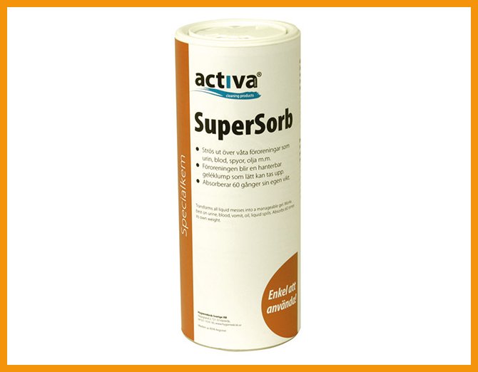 Activa SuperSorb -imeytysjauhe kuivaa pinnoilta ikävät yllätykset, kuten oksennuksen, virtsan, veren tai öljyn. Helppokäyttöinen ja nopeavaikutteinen jauhe imee pinnan kuivaksi ja poistaa pahan hajun jättäen tilalle miedon sitruunantuoksun. Tuote on omiaan niin hotelleihin, ravintoloihin, takseihin, vanhainkoteihin, päiväkoteihin kuin muihinkin kohteisiin, joissa on hyvä olla varautunut yllätyksien torjuntaan.Pakkauskoko: 352 g.