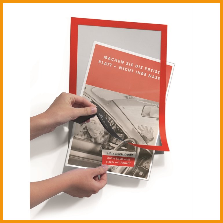 Durable Duraframe on itsekiinnittyvä, magneettisilla kehyksillä varustettu infotasku, jonka sisälle asetetun dokumentin voi vaihtaa vaivattomasti toiseen. Magneettinen kehys avautuu helposti ja sulkeutuu napakasti käden käänteessä.Duraframe kiinnittyy tasaisille pinnoille yhä uudelleen ja uudelleen, joten sen paikkaa on helppo vaihtaa tarpeen mukaan. Läpinäkyvän kehyksen ansiosta dokumentti näkyy molempiin suuntiin, joten Duraframe on omiaan mm. lasioviin.