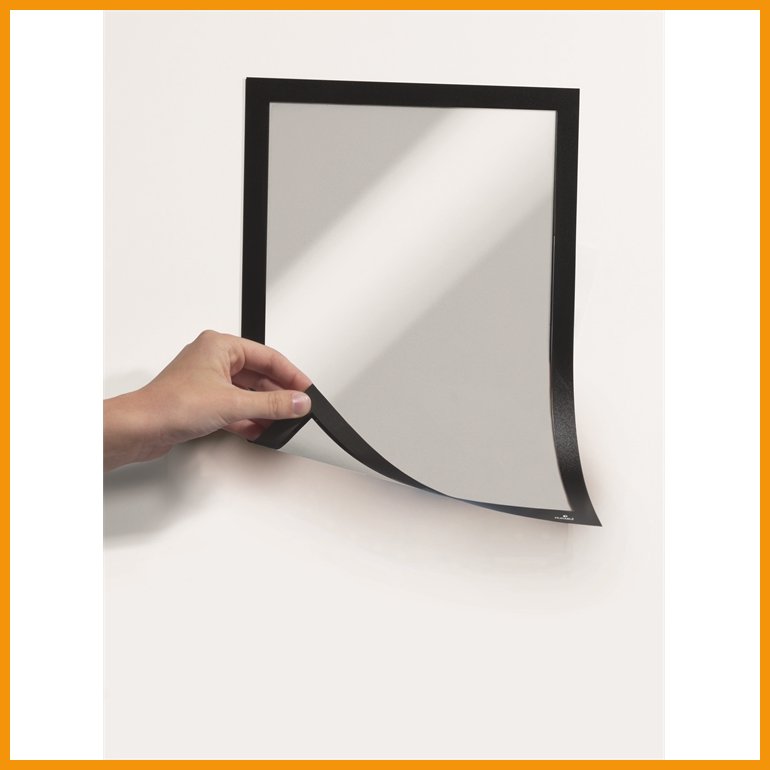 Durable Duraframe Magnetic on magneettisilla kehyksillä varustettu infotasku, jonka sisälle asetetun dokumentin voi vaihtaa vaivattomasti toiseen. Vaivattomasti avautuva ja sulkeutuva magneettinen kehys kiinnittyy napakasti mm. metallipinnoille ja valkotauluihin. Duraframe kiinnittyy tasaisille pinnoille yhä uudelleen ja uudelleen, joten sen paikkaa on helppo vaihtaa tarpeen mukaan.Koko: A4