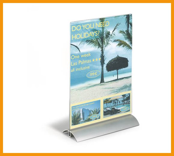 Durable Presenter -infotelineen A4-kokoinen dokumentti näkyy yhtä hyvin molempiin suuntiin. Mm. messuille ja vastaanottotiloihin erinomaisessa telineessä on alumiininen pohja ja kirkas akryylipinta.Koko: A4.